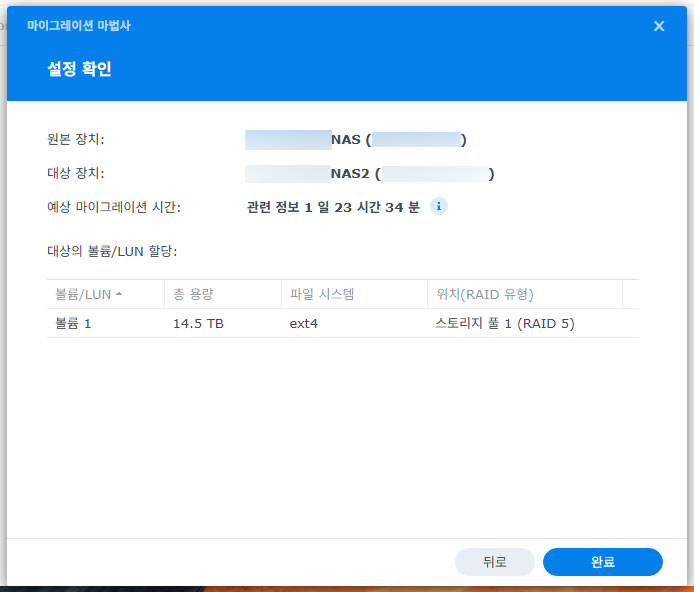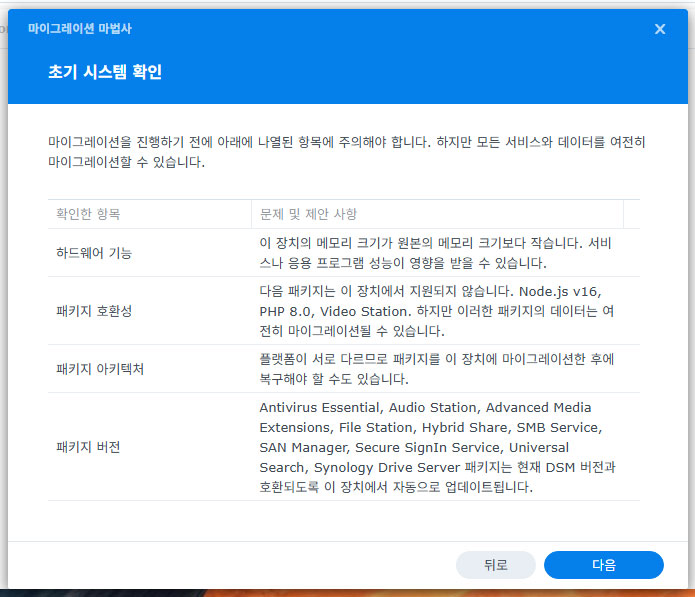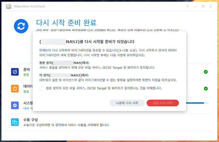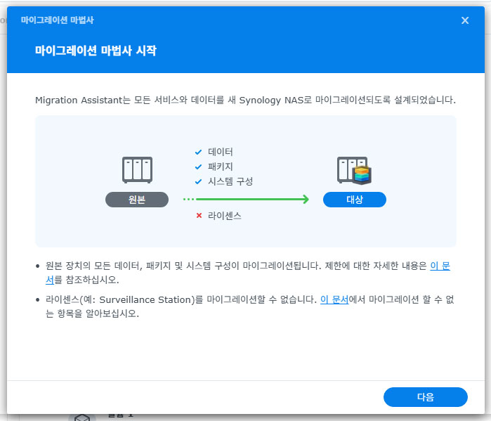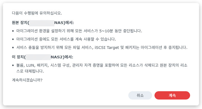 마이그레이션 작업에서 새 NAS의 정보가 모두 삭제된다는 경고문이 뜹니다. 새 NAS에는 DSM 말고 설치된 게 없으므로 계속 진행합니다. 기존 NAS의 패키지 및 설정 또한 복사되므로 앞서 백업해 두었던 구성 정보는 필요가 없어졌습니다.