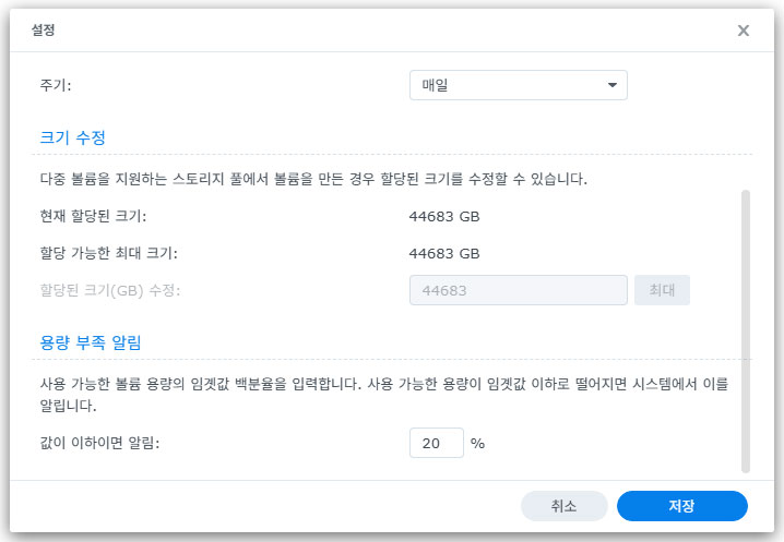 스토리지 풀 하나에 볼륨을 최대 크기로 쓸 수도 있고, 여러 개의 볼륨을 생성해서 쓸 수도 있습니다. 저는 편의상 (NAS를 저만 사용하므로) 최대 크기로 지정했습니다. 물론 볼륨의 크기는 개인의 성향/선택에 달려 있습니다.