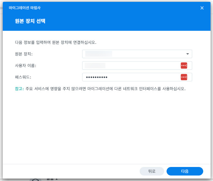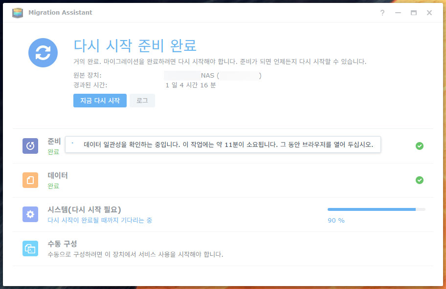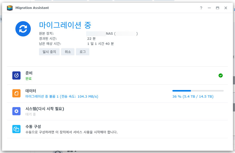 새 NAS의 계정 비밀번호를 입력하면 마이그레이션이 드디어 시작됩니다.