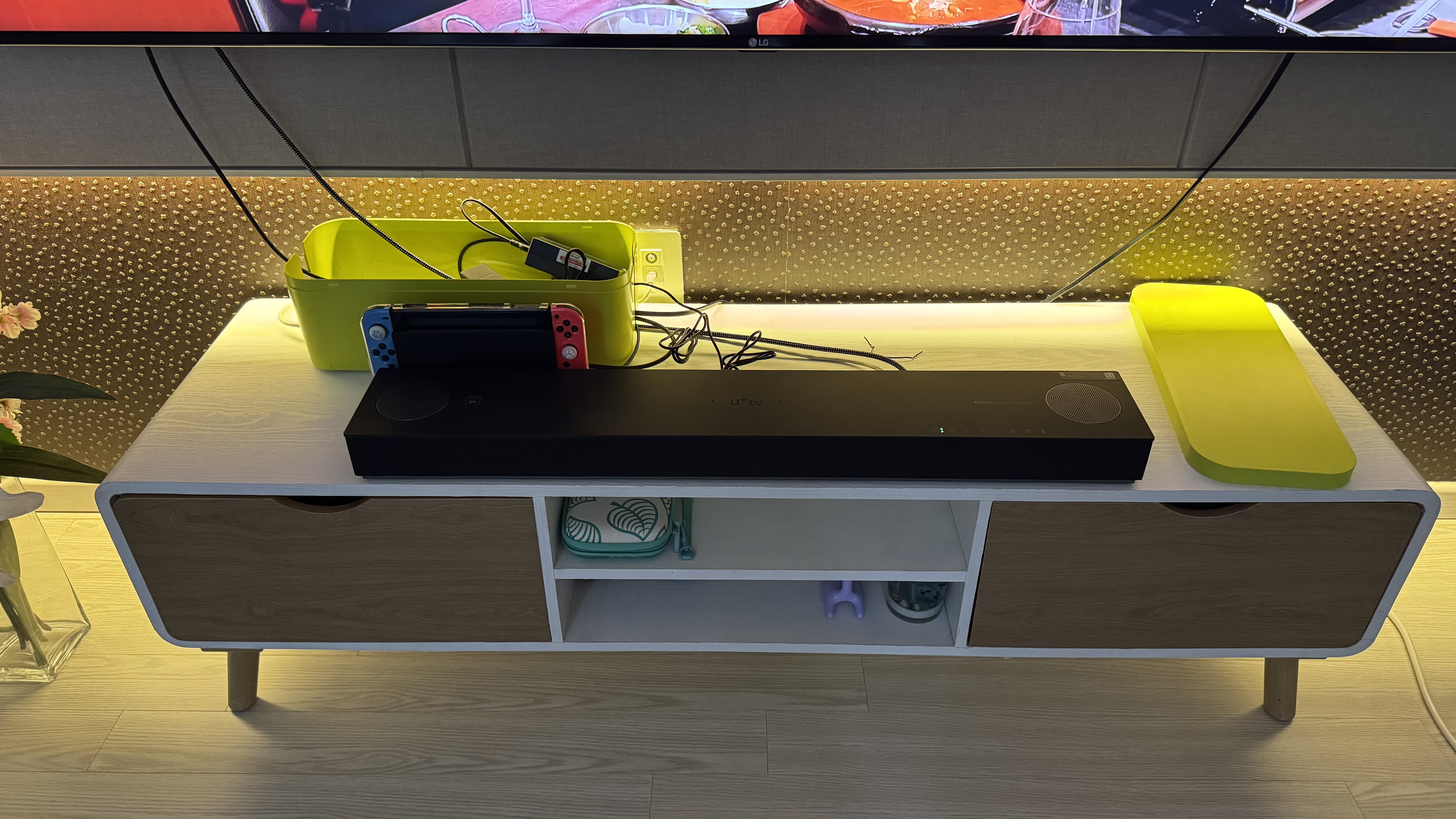 셋톱을 사운드바 블랙 2 모델로 신청했기 때문에 TV장 위에는 사운드바만 놓여 있습니다. 일단은요...