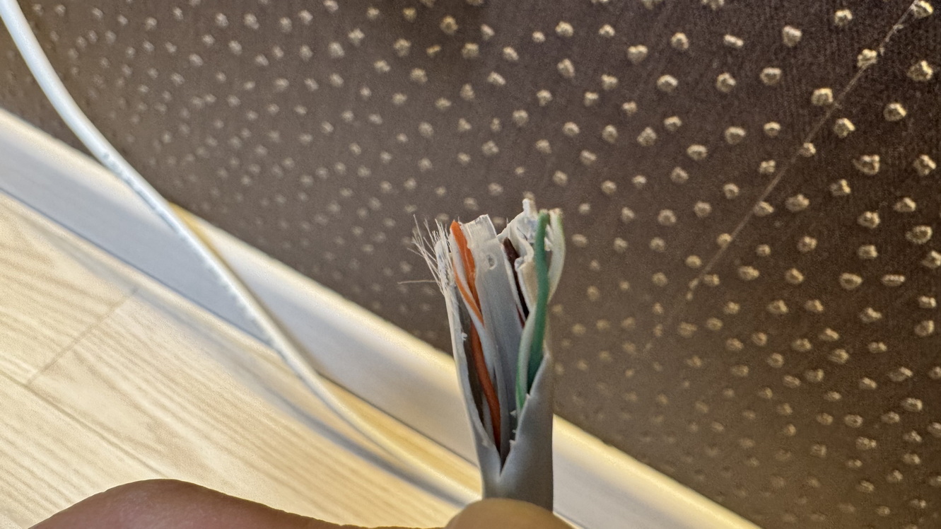 처음에는 어떻게 이런 구멍이 나 있는지 생각이 닿지 않았는데, 단자를 벽에 고정하기 위한 스크루가 벽안의 고정용 판을 지나 그 뒤에 있는 랜선까지 닿으면서 뚫리게 된 것이었습니다. 나중을 생각해서 랜선 길이에 여유를 둬서 벽 안에 수납한 것이 화근이었던 것이죠. 벽 내부에 수납된 길이가 길다 보니 공간을 더 차지하게 되고, 하필이면 그 자리가 스크루가 지나가는 길이었던 것입니다.