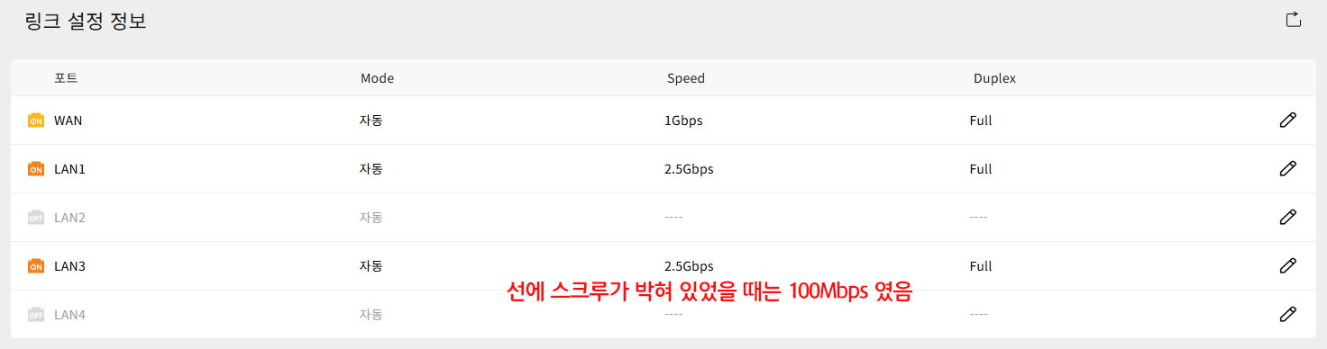 메인이 되는 공유기에서 각 포트별 연결속도를 확인할 수 있습니다. 구멍 난 선을 잘라내고 새로 연결했더니 2.5 Gbps 속도가 나오는 것을 확인할 수 있었습니다. 혹시나 싶어 랜선 교체공사를 한 다른 벽면의 포트들도 확인해 봤는데, 다행히 모두 2.5 Gbps로 연결되었습니다.