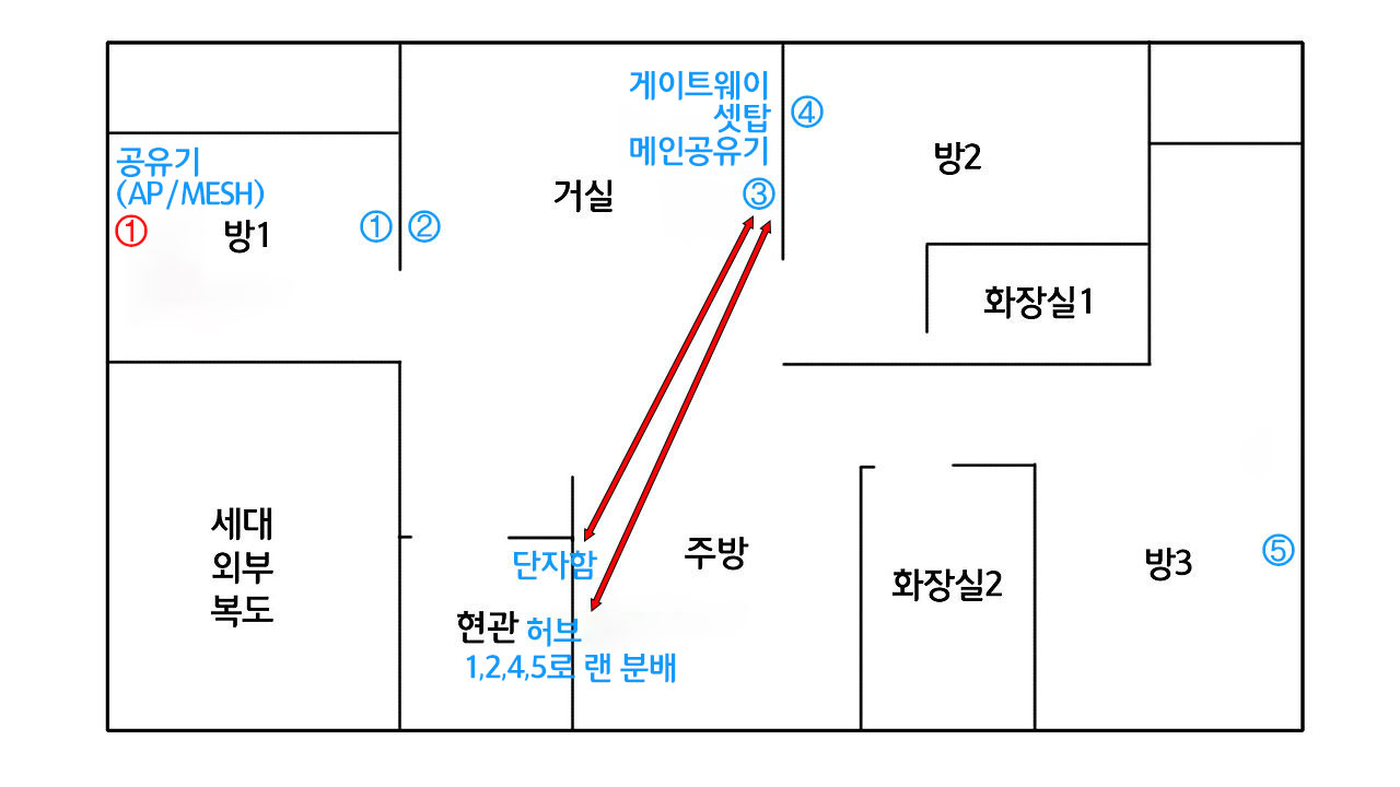 현재 빨간 1번, 파란 3번에 공유기가 놓여 있고 메쉬로 구성되어 있습니다. 최종적으로 파란 5번에 공유기를 하나 더 두고 메쉬 구성을 추가하면 빈틈없는 유/무선 네트워크 구성이 이루어지게 될 것입니다.