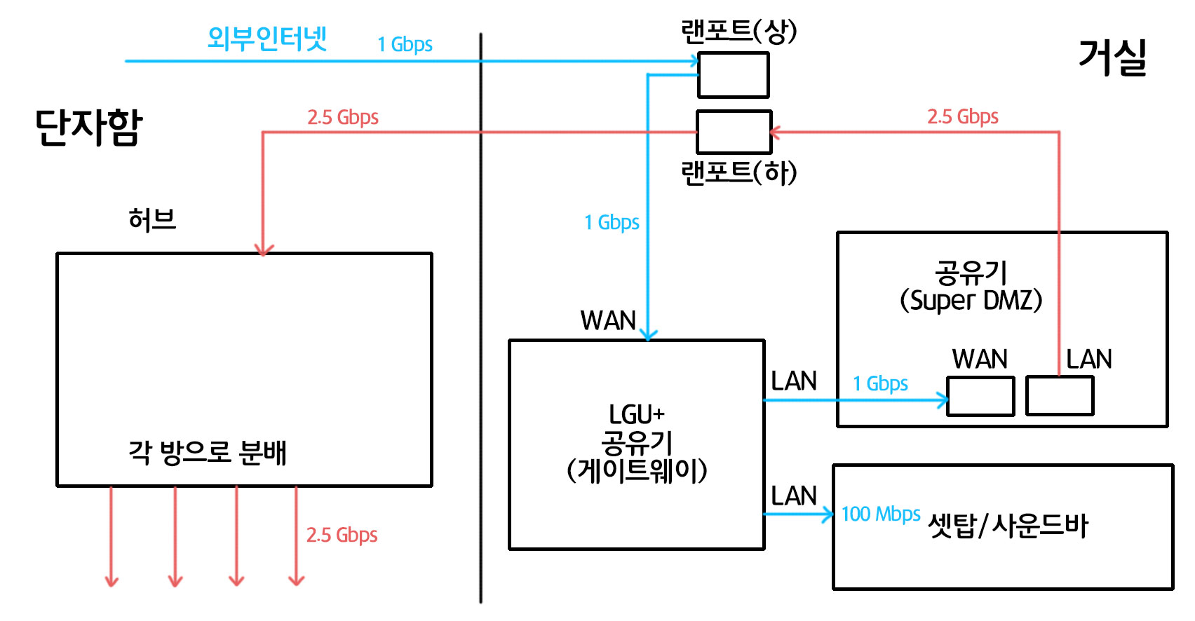2. 메인공유기를 Super DMZ 세팅으로 LGU+ 공유기의 하위에 둡니다. 그리고 거기서 단자함의 허브로 연결합니다.