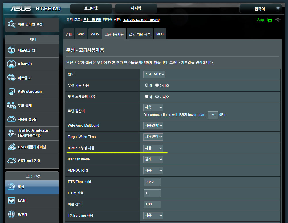 먼저 무선 -> 고급사용자용 -> IGMP 스누핑 사용을 "사용"으로 설정합니다.