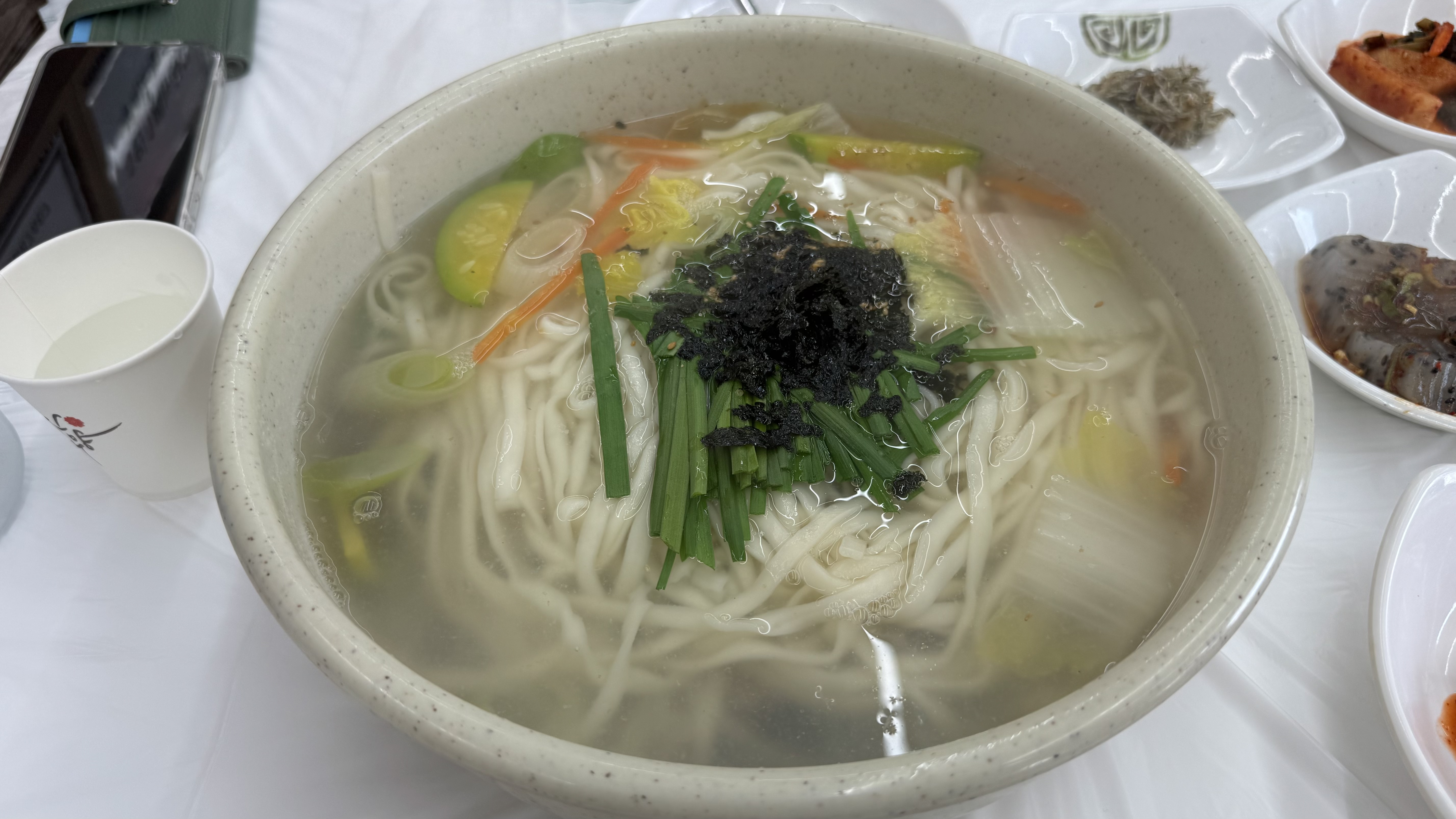 큼지막한 그릇에 2인분이 담겨 나왔습니다. 맑은 국물에 칼국수, 부추, 김, 호박, 당근, 배추, 파, 양파 등이 보입니다. 바지락은 안 보이는 곳에 잠수(?)해 있는데 양이 정말 많았습니다. 채소와 더불어 해산물 특유의 감칠맛이 있는 국물인데 짜지 않아서 은근히 계속 마시게 되는 맛입니다. 그리고 칼국수도 적당히 잘 삶아져서 밀가루 냄새가 나지 않았습니다. 국자로 바지락을 끝도 없이 건져 먹으니 배가 부릅니다.