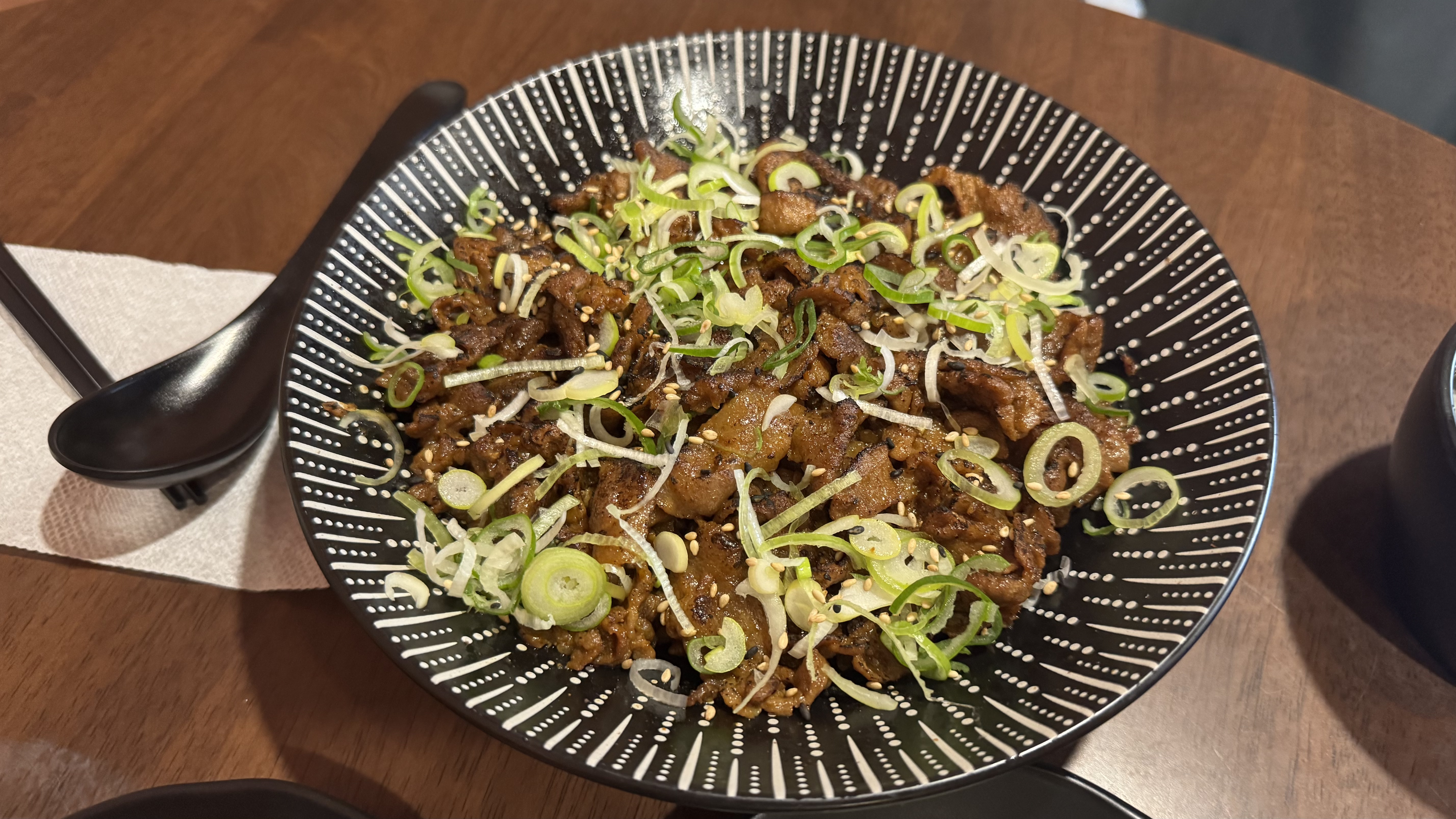 아내가 주문한 고기덮밥. 고기는 직화로 구운 듯한 느낌으로 불향이 나며 적당히 간이 되어 있습니다. 밥이 밑에 깔려 있는데 밥에도 양념간이 되어 있어서 그냥 떠먹어도 됩니다. 얇게 썬 대파가 고명으로 올라가 있어서 적당한 식감과 향을 제공합니다. 비빔면도 그렇고 고기덮밥 역시 아내와 함께 나눠 먹었는데 이걸 먹으니 그나마 속이 든든해졌습니다.