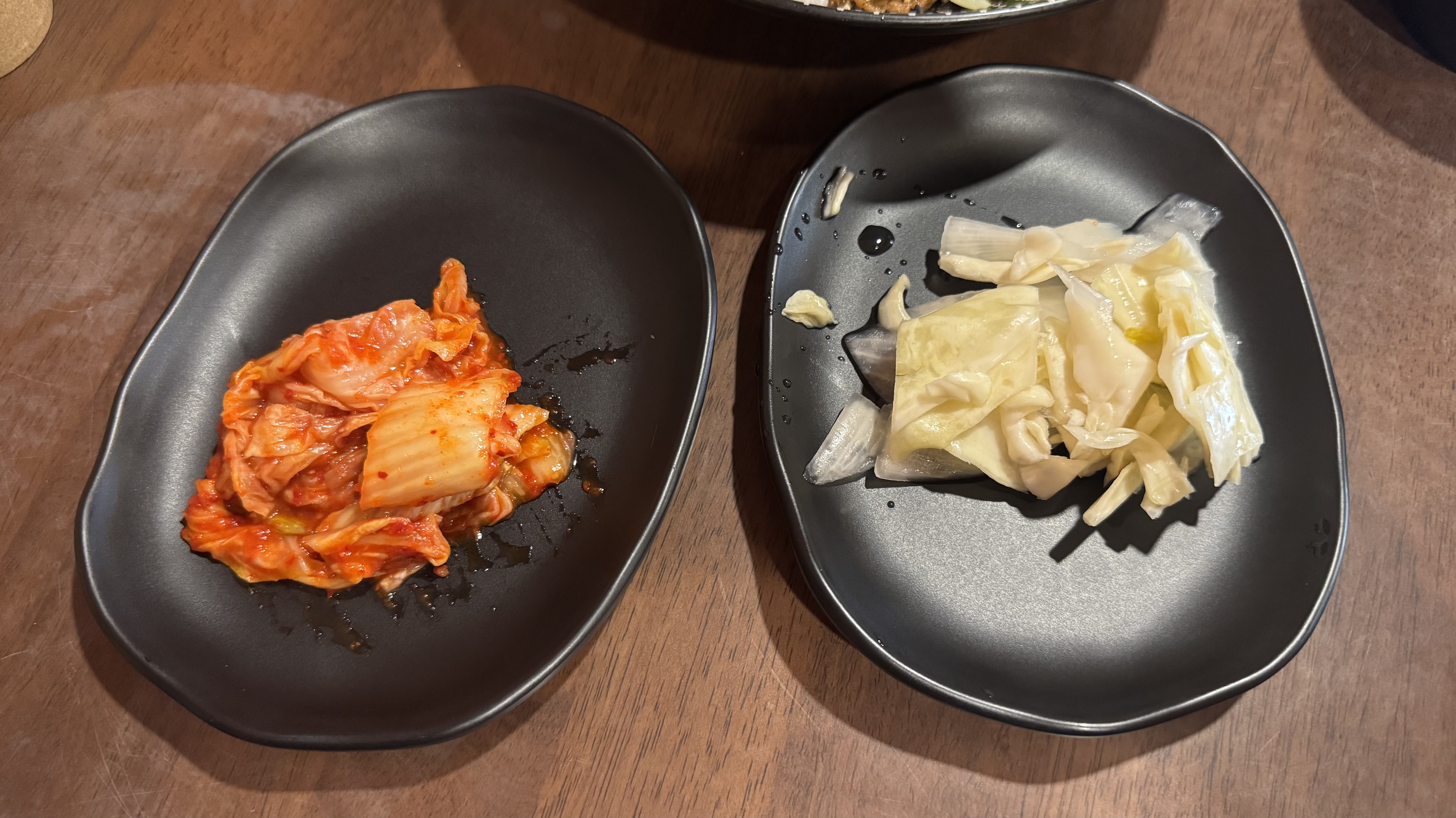 처음 한 번은 직원이 가져다주는 반찬. 김치와 양파/배추 혼합 절임입니다. 이후에는 직접 가져다 먹으면 됩니다. 김치는 깊은 맛은 없고 여느 식당에서 흔히 사용하는 중국산 김치라고 생각됩니다. 상큼하고 아삭한, 전형적인 절임(피클)은 비빔국수와 고기덮밥에 고루 잘 어울립니다.